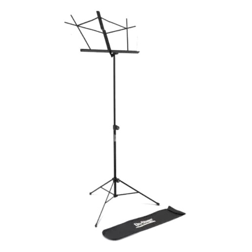 Para facilitar o transporte, a estante é dobrável e acompanha uma bolsa resistente com fecho e alça de ombro, ideal para músicos em movimento.
