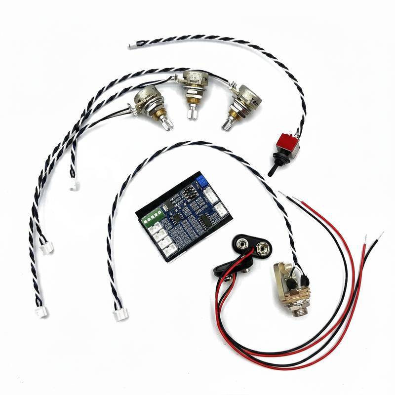 Os kits de pré-amplificador IPA incluem: Potenciômetros de EQ de 100K pré-cabeados, chave seletora ativo/passivo pré-cabeada, jack de saída pré-cabeado e conectores de bateria.